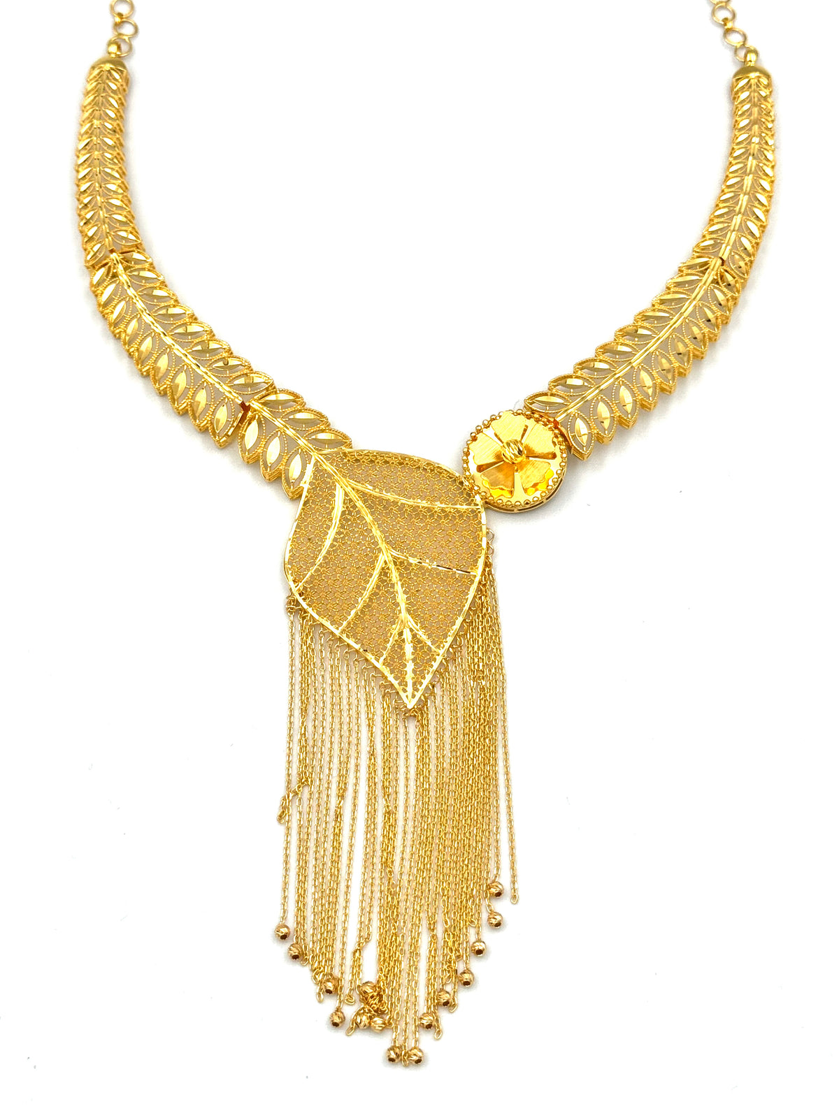 This exquisite 22K gold necklace and earrings set radiates elegance and style. Crafted with attention to detail, it’s a perfect blend of classic and contemporary design. Ideal for weddings, anniversaries, or any special occasion, this jewelry set enhances your beauty with its rich golden hue and intricate craftsmanship.